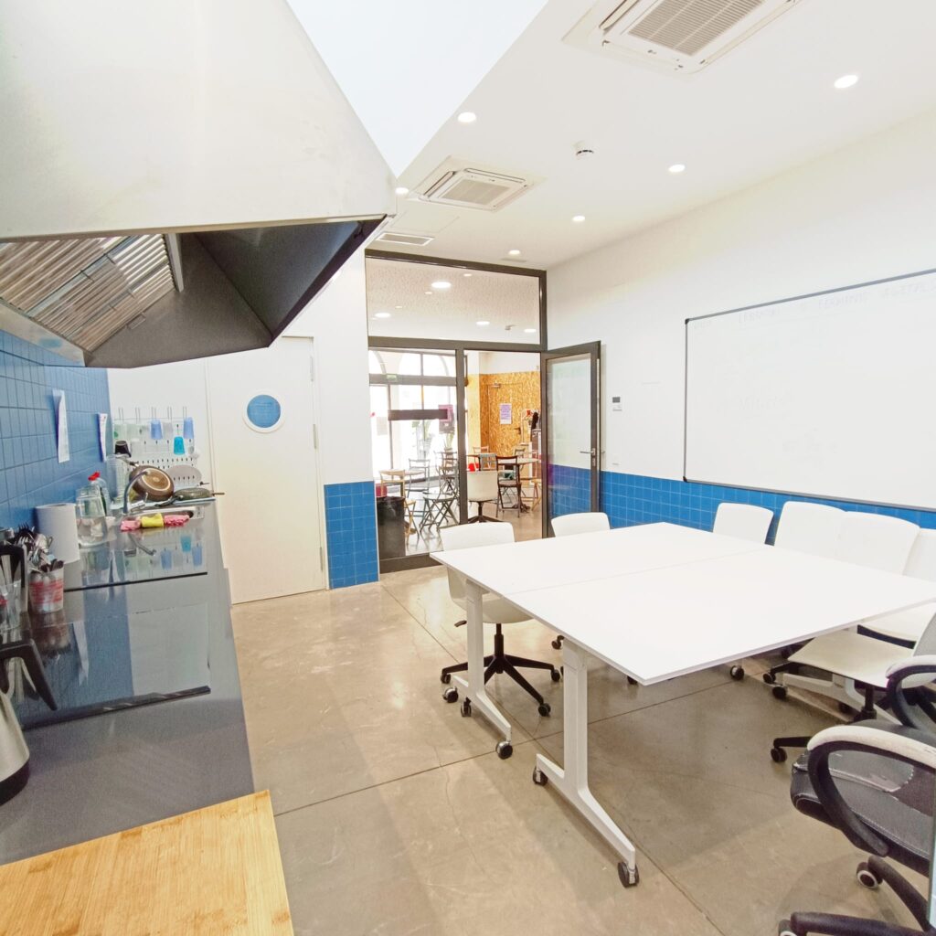 La Cuina i la Bricoteca són dues sales d’una mida reduïda adients per a trobades, activitats i tallers de grups petits (fins a 12 persones). La cuina disposa de punt d’aigua, servei d’inducció i estris per cuinar. Ambdues disposen de taules i cadires.